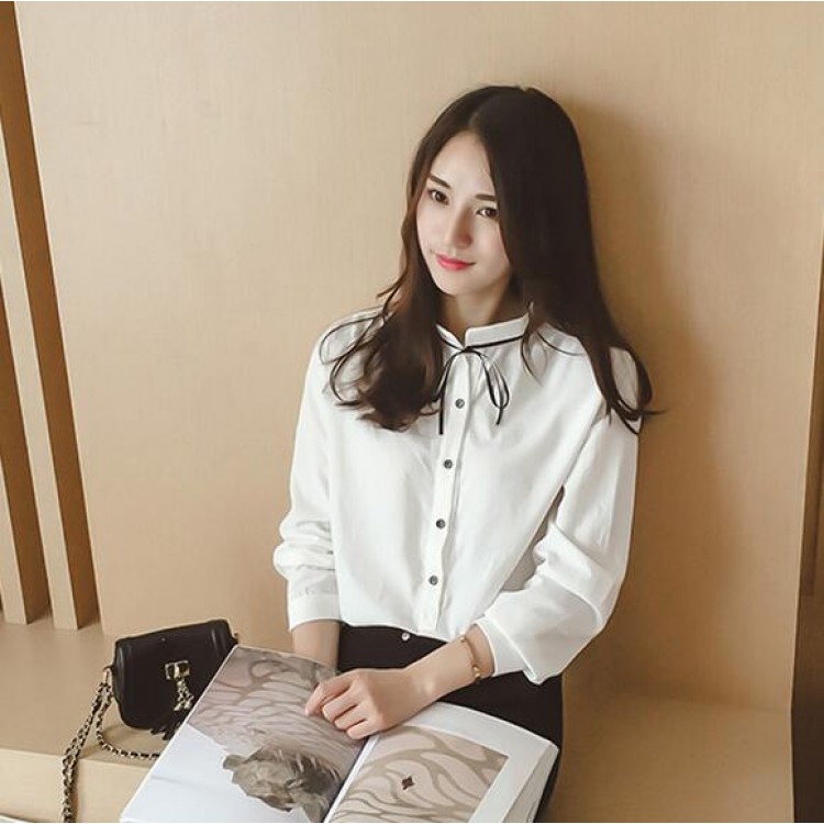 TE128XXYJ Koreanische Modebluse in reiner Farbe mit Schnürung am Ausschnitt