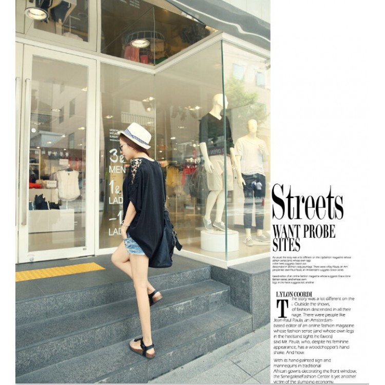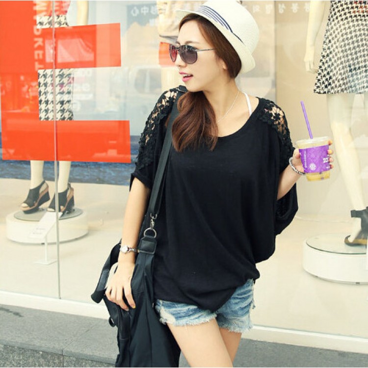 TE1238 Koreanisches T-Shirt mit losen Spitzenschultern und Fledermausärmeln